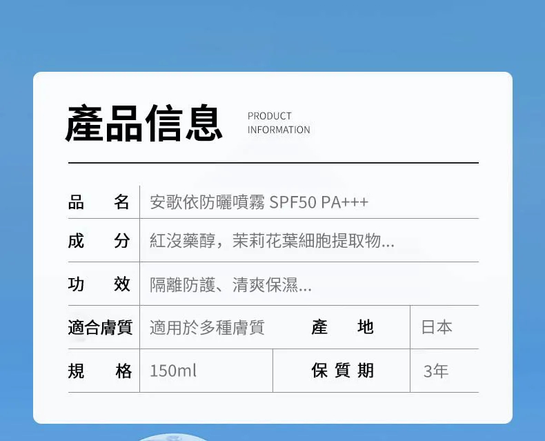 5分鐘前安歌依光圈防曬噴霧,細密噴頭設計 噴頭360°可旋轉自然膚惑,隔離防曬一瓶搞定 - 特大優惠「安歌依光圈防曬噴霧」4入96%用戶的選擇!NT$1198【限時免運】